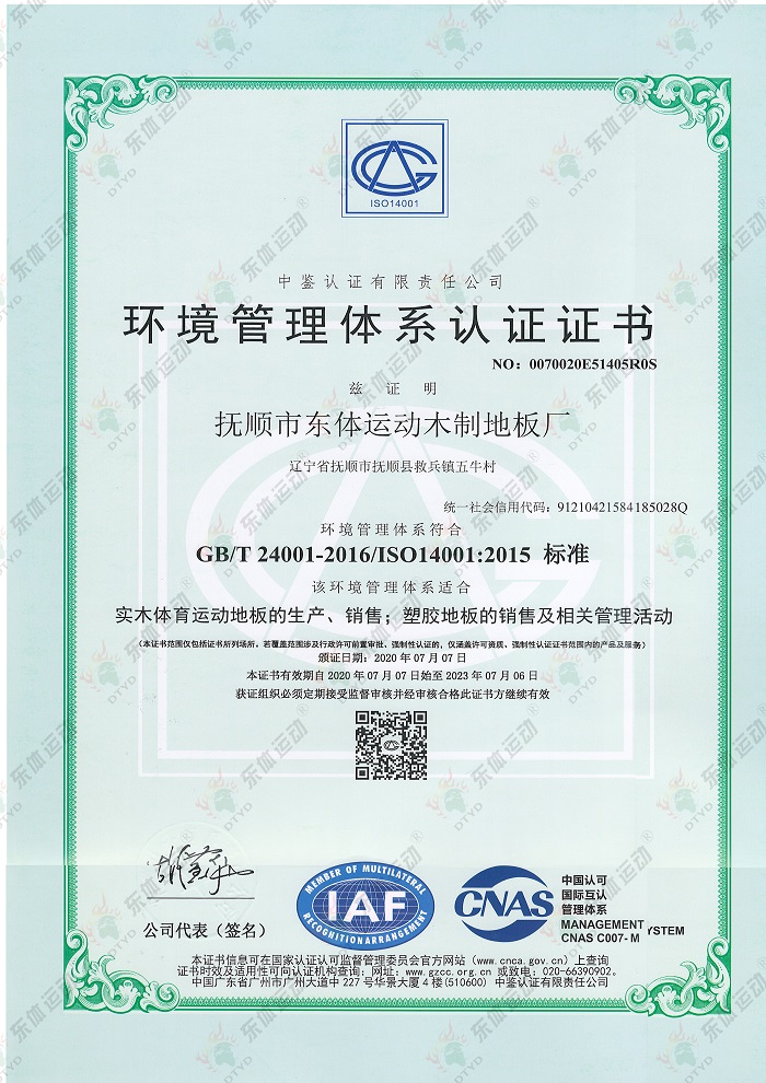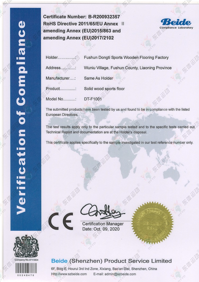 “東體運動”木地板系列產品已經通過國際籃聯檢測、世界羽聯認證、歐盟體育地板專項標準CE認證、歐盟環保產品CE認證、FSC世界森林協會認證、五星級售后服務企業認證等,是中國職業籃球俱樂部遼寧沈陽三生飛豹籃球俱樂部官方合作伙伴,內蒙古籃球協會戰略合作伙伴。